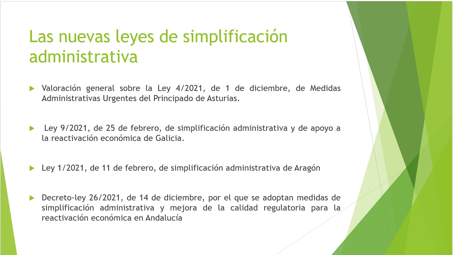 El segundo bloque, centrado en las nuevas leyes de simplificación administrativa repasó someramente diferentes leyes autonómicas, muy en relación con la entrada de fondos europeos. En este punto hizo hincapié en el “vuelco” dado por la legislación andaluza, aún pendiente de una valoración funcional para comprobar “hasta qué punto es útil. Mientras en Asturias nos ha faltado un poco de ambición, además de haber evaluado lo que ya se estaba haciendo, frente a Galicia, que crea un sistema de ventanilla única para recabar información, que no obliga a ir al ciudadano de ventanilla en ventanilla, y la figura de los ayuntamientos emprendedores, donde se adhieren a un sistema de implementación de la inversión donde todos los formularios y ordenanzas sean similares en toda la comunidad autónoma, facilitar la presentación de documentación entre otros requisitos.