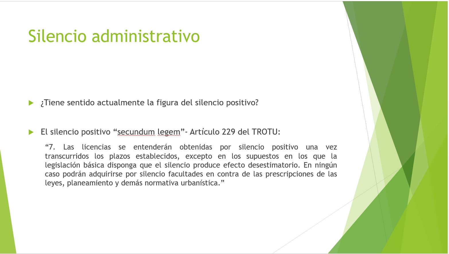 En cuanto al silencio administrativo, lanzó la pregunta de si tiene sentido esta figura actualmente. En su opinión, la tiene cuando compromete un riesgo medioambiental, patrimonial o de índole similar, pero no para asuntos menores, poniendo como ejemplo una disposición del Reglamento de Ordenación del Territorio y Urbanismo (TROTU), que calificó como “no adecuadas”.