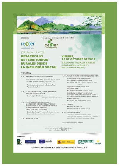 La inclusión social como valor a aportar en el desarrollo de los territorios rurales centrará la jornada LEADER organizada por el Grupo de Desarrollo Rural Navia-Porcía el próximo viernes 25 de octubre, para la que es imprescindible inscripción previa, en la Casa de Cultura Juan de Mairena de Tapia.