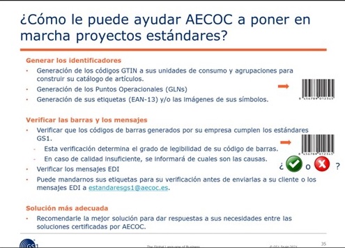 Un día después, martes día 18, se celebró el webinario “Primeros pasos para poner en marcha códigos de barras GS1 en productos frescos impartido por la Asociación de Fabricantes y Distribuidores (AECOC); asociación que reúne a más de 30.000 empresas españolas de diferentes sectores de actividad como hostelería y restauración, textil, ferretería y bricolaje, salud, libros, etcétera. La misión de esta asociación es "mejorar la competitividad de toda la cadena de valor, compartiendo soluciones, estándares y conocimiento para hacerla más eficiente y sostenible, aportando mayor valor al consumidor". Además, AECOC es la representante en España de la organización global GS1, líder mundial  en el desarrollo y la promoción de los principales estándares tecnológicos.