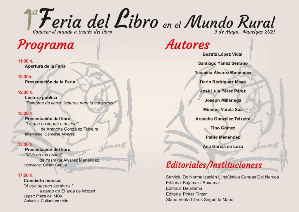 La Casa de Cultura de Navelgas, en colaboración con la Asociación Cultural el Arbedeiro, organiza la I Feria del Libro en el Mundo Rural el próximo domingo, 9 de mayo. Se trata de un evento cultural que tiene por objetivo la promoción y fomento del libro y la lectura a través de diferentes actividades que se desarrollarán al aire libre en distintos espacios de la localidad de Navelgas.
